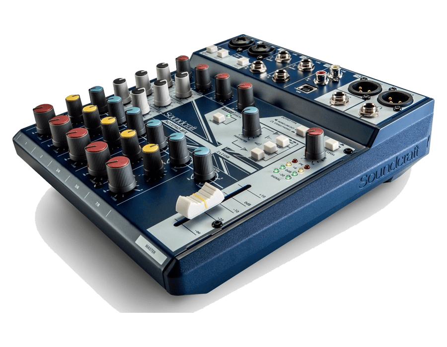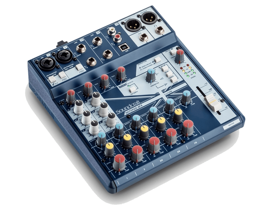 La Consola Mixer Soundcraft Notepad-8fx Usb es ideal para mezclar en el escenario o grabar en tu estudio casero. Este mezclador compacto de 8 canales incluye 2 preamplificadores de micrófono con alimentación phantom, filtros de paso alto de 100 Hz y ecualizadores de 3 bandas. El canal 1 incluye una entrada de nivel de instrumento hi-Z para ejecutar guitarra o bajo directo. Las entradas de nivel de línea en 3 canales adicionales acomodan teclados, dispositivos de reproducción y equipo de música de consumo. Los efectos digitales de Lexicon incorporados incluyen delay, chorus y reverb. Tap tempo y una perilla de ajuste de parámetros le permiten marcar cada efecto para su material. USB proporciona conectividad de 2 entradas / 2 salidas para grabación y transmisión de audio. Las salidas incluyen opciones de monitoreo flexibles y salidas principales XLR balanceadas.